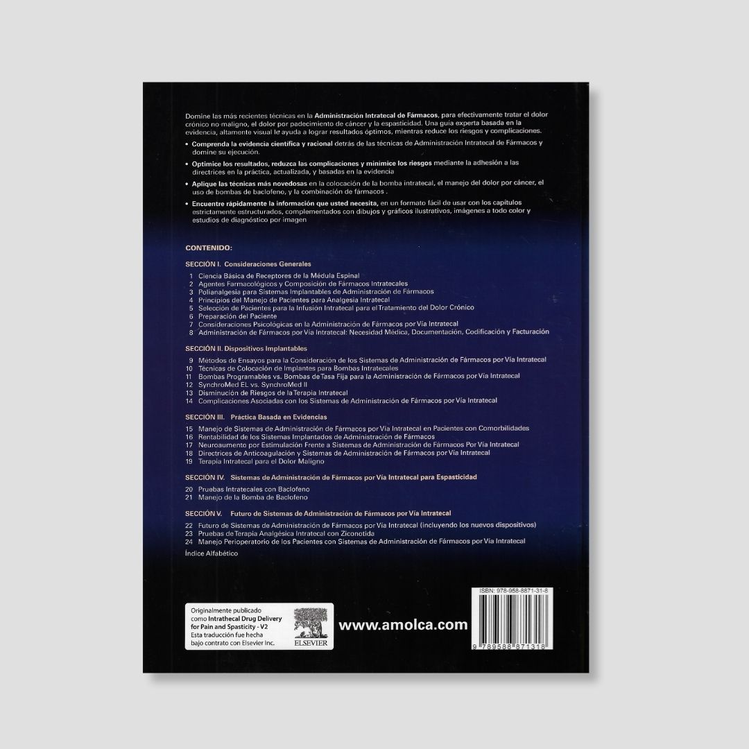 “Domine las más recientes técnicas en el Administración Intratecal de Fármacos, para efectivamente tratar el dolor crónico no maligno, el dolor por padecimiento de cáncer y la espasticidad. Una guía experta basada en la evidencia, altamente visual le ayuda a lograr resultados óptimos, mientras reduce los riesgos y complicaciones. –Comprenda la evidencia científica y racional detrás de las técnicas de suministro Intratecal de fármacos y domine su ejecución. –Optimice los resultados, reduzca las complicaciones y minimice los riesgos mediante la adhesión a las directrices en la práctica, actualizada, y basadas en la evidencia –Aplique las técnicas más novedosas en la colocación de la bomba intratecal, el manejo del dolor por cáncer, el uso de bombas de baclofeno, y la combinación de fármacos. –Encuentre rápidamente la información que Ud., necesita, en un formato fácil de usar con los capítulos estrictamente estructurados, complementados con dibujos y gráficos ilustrativos, imágenes a todo color y estudios de diagnóstico por imagen”