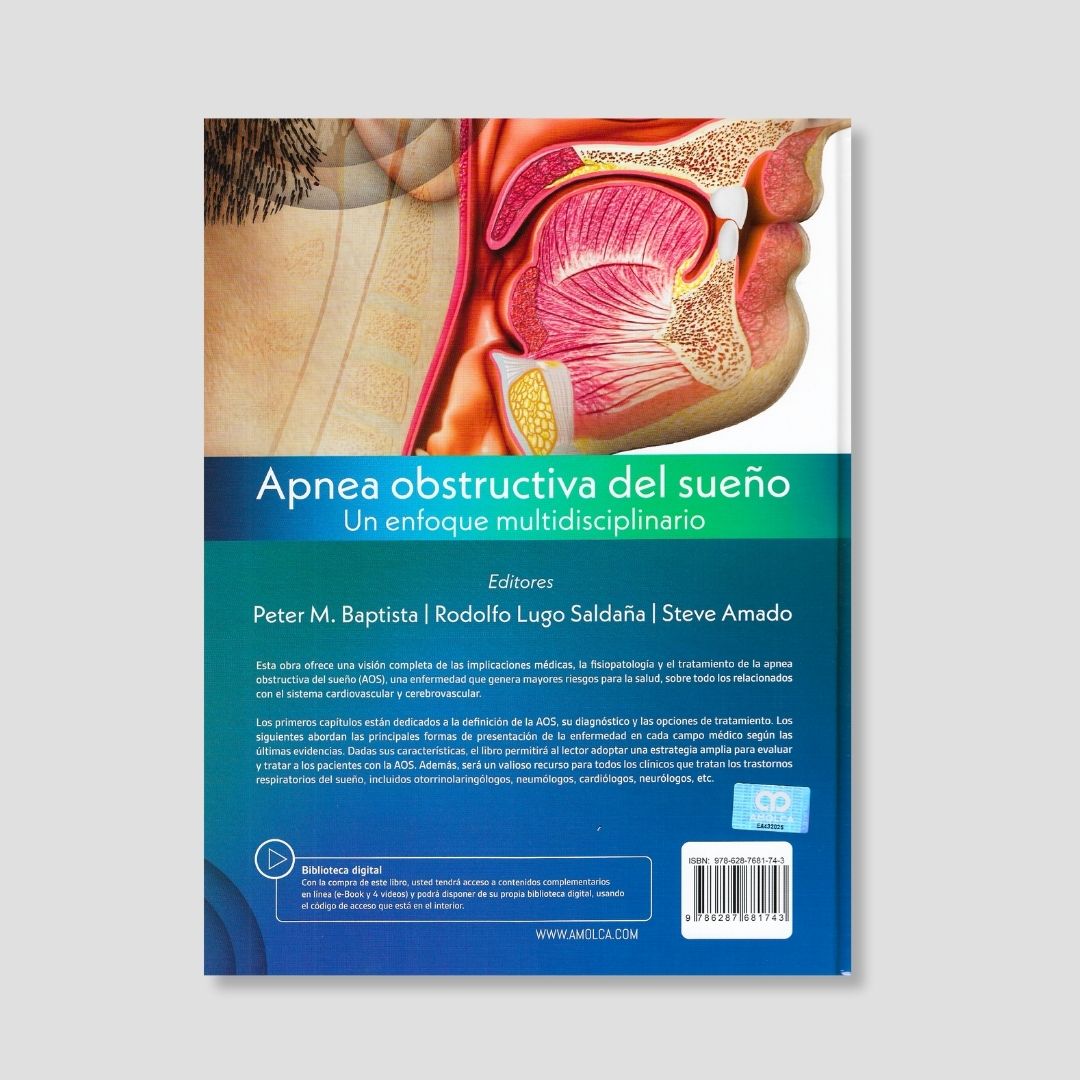 “Apnea obstructiva del sueño: un enfoque multidisciplinario”, editado por Peter M. Baptista, Rodolfo Lugo Saldaña y Steve Amado, es una obra de referencia que aborda de forma integral y actualizada la apnea obstructiva del sueño (AOS). Reúne a expertos internacionales de múltiples disciplinas para analizar desde la fisiopatología y el diagnóstico hasta los tratamientos quirúrgicos y no quirúrgicos, incluyendo terapia miofuncional orofacial, AOS en niños y sus vínculos con enfermedades cardiovasculares, neurológicas, autoinmunes, endocrinológicas y más. Destaca el impacto de la AOS en oftalmología, odontología, ginecología, gastroenterología, psiquiatría y salud pública, promoviendo un manejo verdaderamente multidisciplinario. Con sólida base científica y enfoque práctico, es una herramienta esencial para especialistas en sueño, otorrinolaringólogos, neumólogos, médicos generales y todos los profesionales de la salud que atienden pacientes con esta patología.