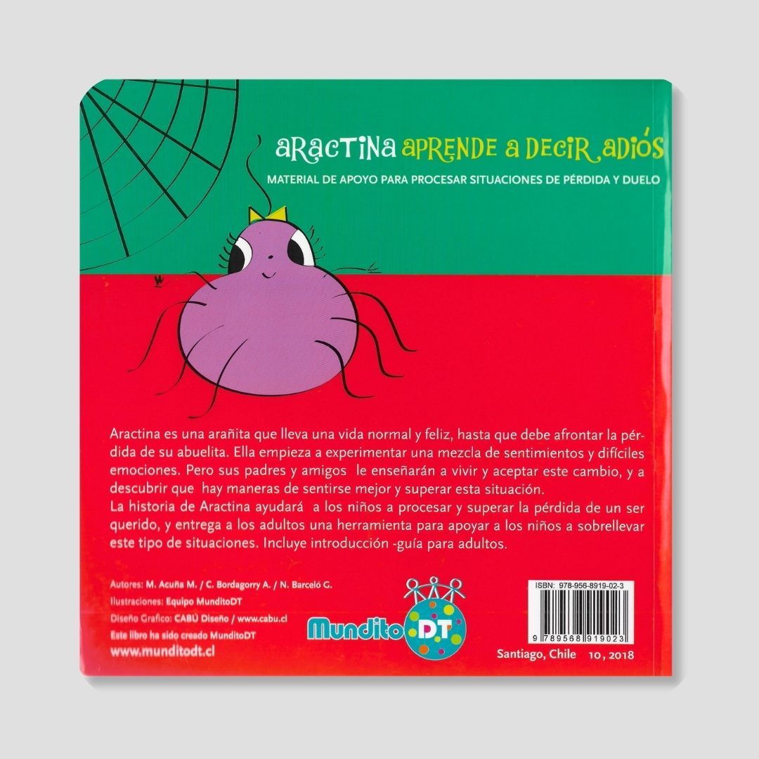 Aractina aprende a decir adiós es una historia conmovedora que acompaña a los niños en el difícil proceso de enfrentar la pérdida de un ser querido. Aractina, una pequeña arañita que llevaba una vida feliz y tranquila, debe afrontar la muerte de su abuelita, lo que la sumerge en una mezcla de emociones nuevas y complejas como la tristeza, la confusión y la añoranza.