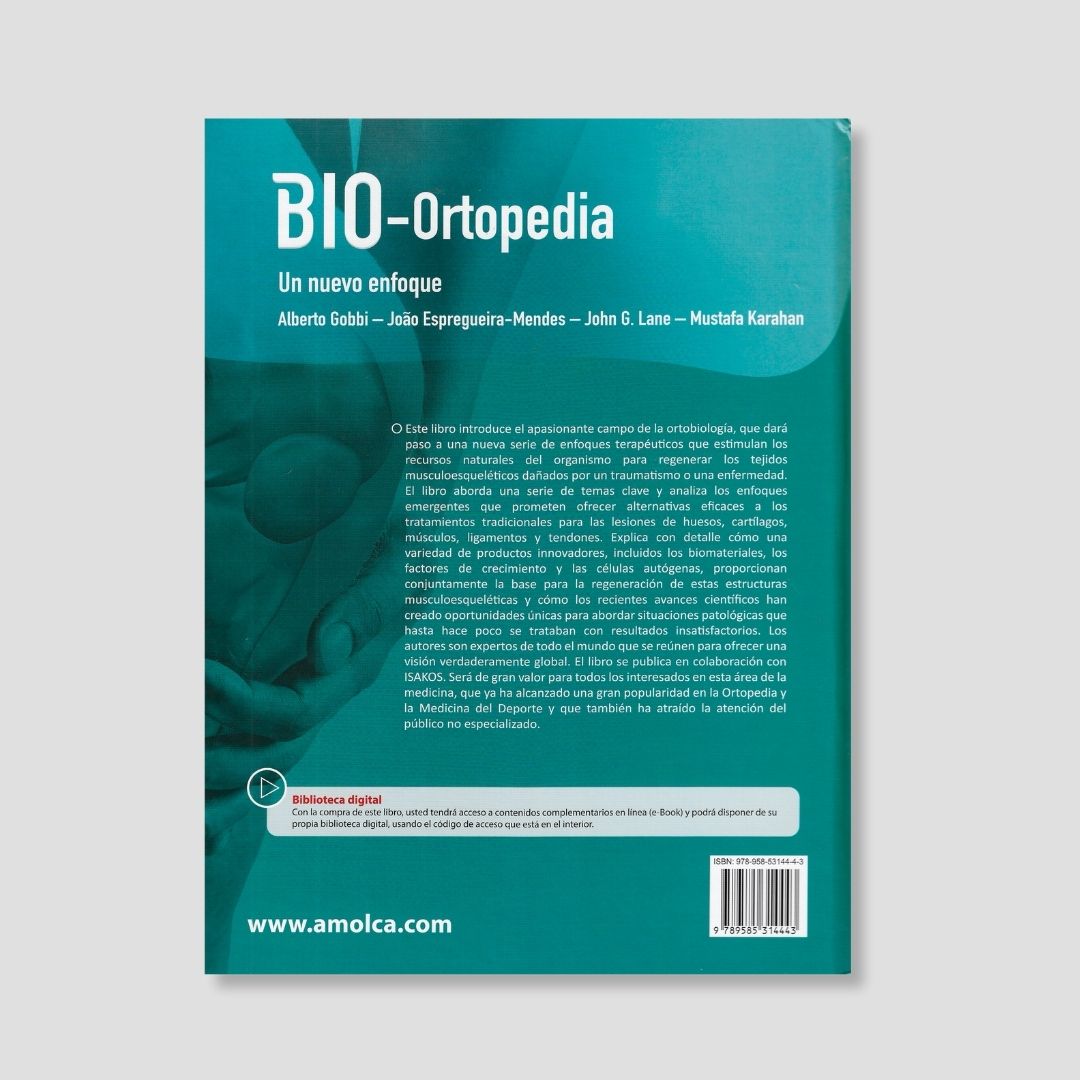 “Bio-Ortopedia”, editado por Alberto Gobbi, João Espregueira-Mendes, John G. Lane y Mustafa Karahan (reconocidos especialistas en ortopedia y medicina deportiva), es un tratado exhaustivo con contribuciones de expertos de 16 países (Italia, Brasil, Japón, EE.UU., entre otros). Reúne los últimos avances en biología celular y molecular para la regeneración musculoesquelética mediante terapias ortobiológicas (células madre mesenquimales, ácido hialurónico, concentrado de médula ósea, PRP, andamios celulares, xenoinjertos). Estructurado en 7 partes y 54 capítulos: parte general (PRP actual, terapia génica, ortobiología, biomateriales) y secciones específicas por tejido (músculo, tendón, ligamentos, meniscos, hueso, cartílago), con anatomía, patologías y tratamientos regenerativos. Edición española incluye capítulo exclusivo sobre optimización metabólica en procedimientos regenerativos, >300 imágenes y acceso a curso online de bio-ortopedia (conferencias de Gobbi, Espregueira-Mendes y Lane) organizado por la Asociación Argentina de Traumatología del Deporte. Referencia actual e indispensable para traumatólogos, cirujanos ortopédicos y especialistas en medicina deportiva.