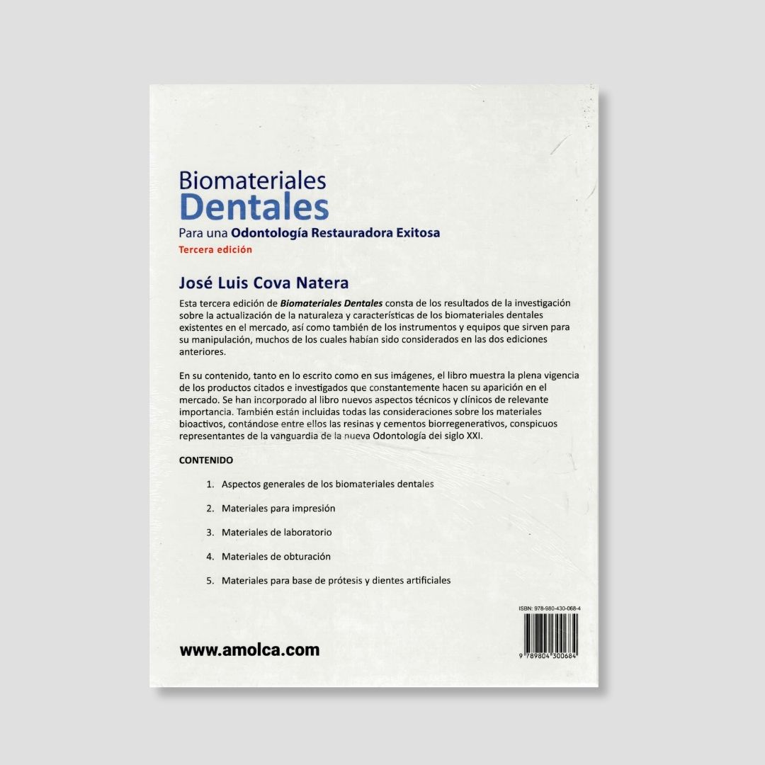 Biomateriales Dentales. Para una Odontología Restauradora Exitosa (3.ª edición) es una obra integral que recopila los avances más recientes en el estudio de los biomateriales utilizados en odontología restauradora. La obra aborda no solo las propiedades y características de los materiales dentales disponibles en el mercado, sino también los instrumentos y equipos necesarios para su correcta manipulación, actualizando y ampliando lo presentado en las ediciones anteriores.