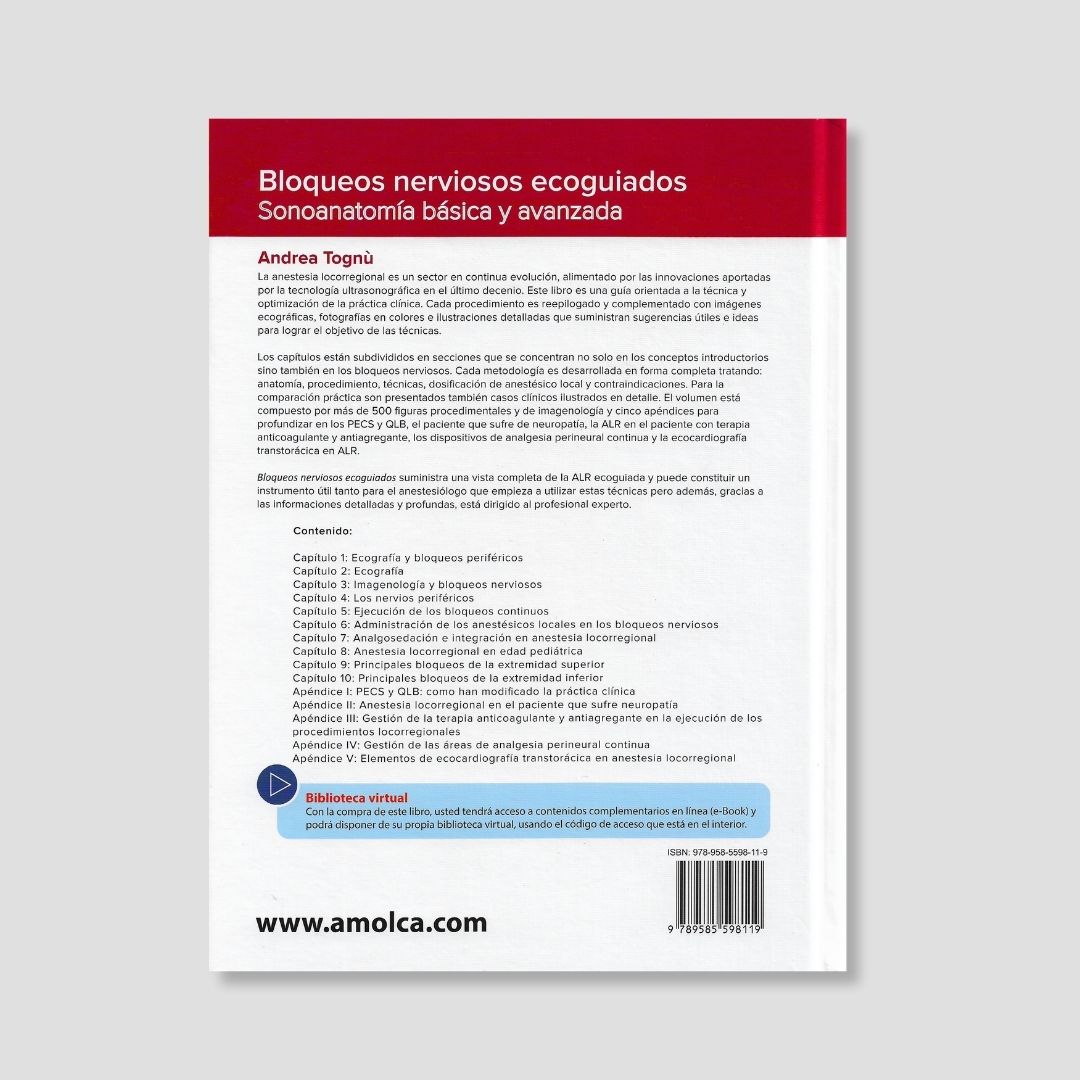 “La anestesia locorregional es un sector en continua evolución, alimentado por las innovaciones aportadas por la tecnología ultrasonográfica en el último decenio. Este libro es una guía orientada a la técnica y optimización de la práctica clínica. Cada procedimiento es repilogado y complementado con imágenes ecográficas, fotografías en colores e ilustraciones detalladas que suministran sugerencias útiles e ideas para lograr el objetivo de las técnicas. Los capítulos están subdivididos en secciones que se concentran no solo en los conceptos introductorios sino también en los bloqueos nerviosos. Cada metodología es desarrollada en forma completa tratando: anatomía, procedimiento, técnicas, dosificación de anestésico local y contraindicaciones. Para la comparación práctica son presentados también casos clínicos ilustrados en detalle. El volumen está compuesto por más de 500 figuras procedimentales y de imagenología y cinco apéndices para profundizar en los PECS y QLB, el paciente que sufre de neuropatía, la ALR en el paciente con terapia anticoagulante y antiagregante, los dispositivos de analgesia perineural continua y la ecocardiografía transtorácica en ALR. Bloqueos nerviosos ecoguiados suministra una vista completa de la ALR ecoguiada y puede constituir un instrumento útil tanto para el anestesiólogo que empieza a utilizar estas técnicas, pero, además, gracias a las informaciones detalladas y profundas, está dirigido al profesional experto.”