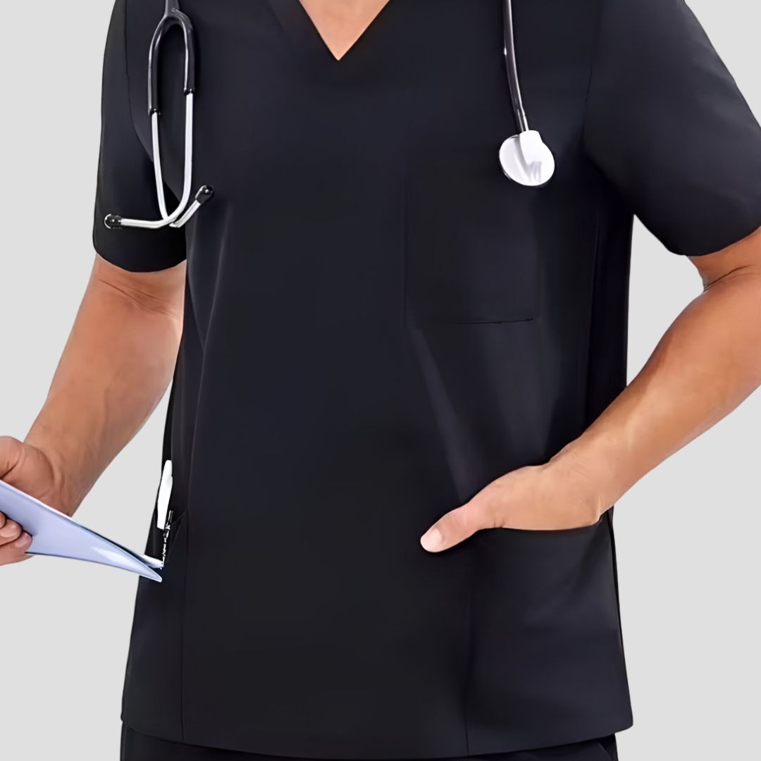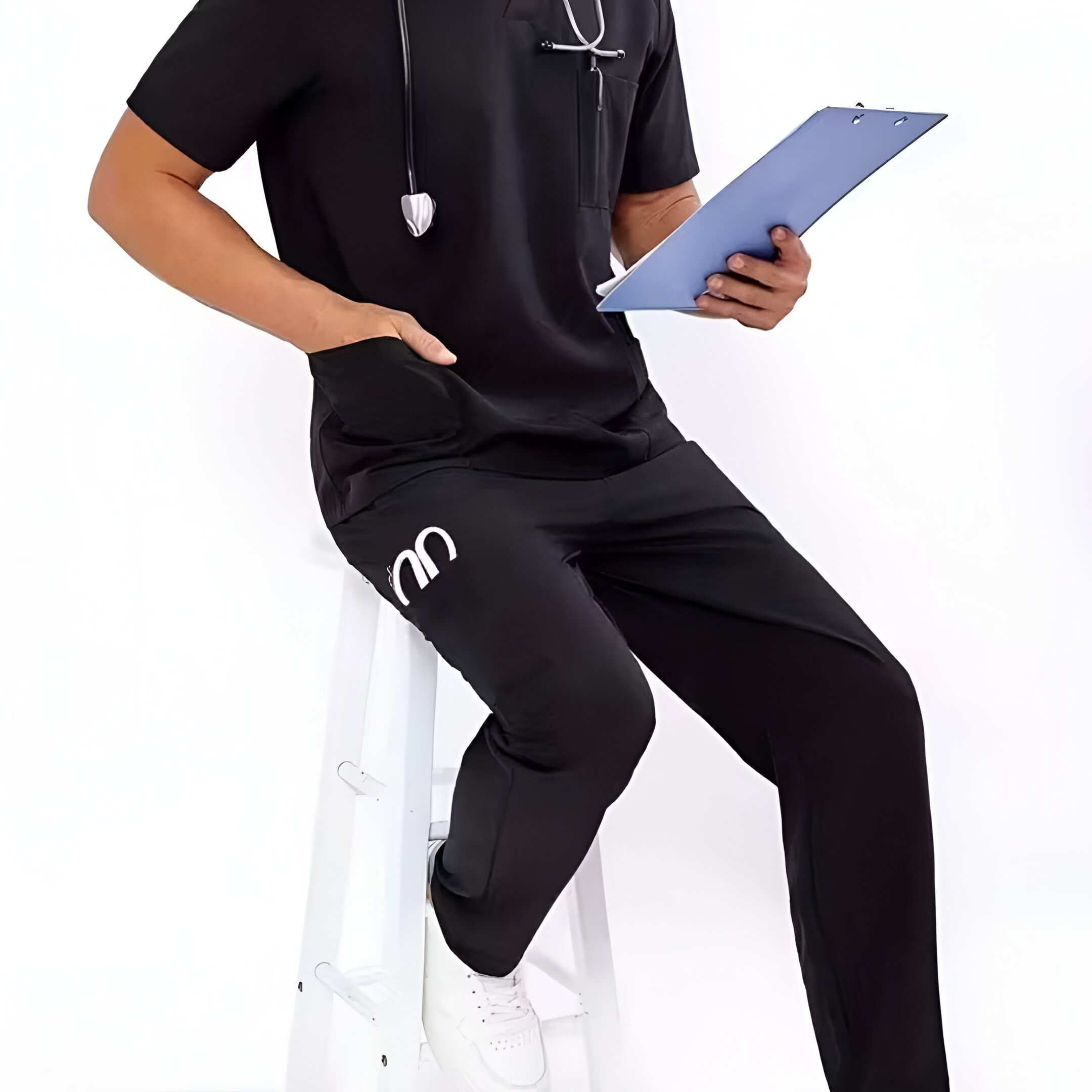 Este conjunto uniforme médico para hombre está diseñado para ofrecer comodidad, funcionalidad y una imagen profesional durante largas jornadas de trabajo, especialmente en temporadas cálidas. Su diseño práctico incluye una camisa con cuello en V que facilita la ventilación y permite mayor libertad de movimiento, ideal para entornos clínicos, hospitalarios o de atención al paciente.
