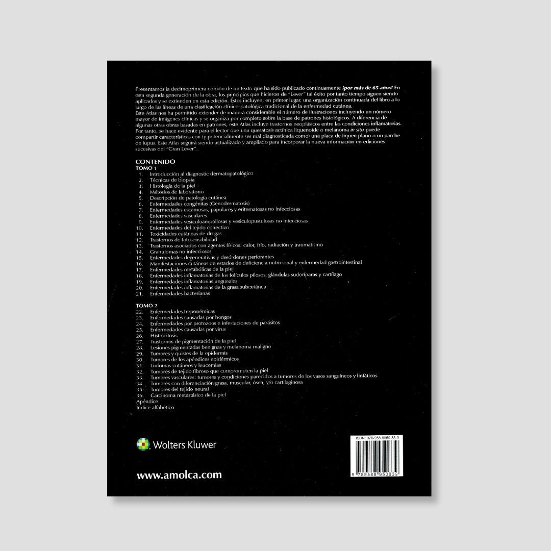 Histopatología de la Piel de Lever es un atlas clásico y de referencia mundial en dermatopatología, con más de 65 años de evolución continua. En su decimoprimera edición mantiene su enfoque clínico-patológico tradicional, organizado por patrones histológicos, integrando de manera comparativa enfermedades inflamatorias y neoplásicas de la piel. Con un amplio y actualizado conjunto de imágenes histológicas y clínicas, la obra facilita la correcta interpretación diagnóstica y la diferenciación de entidades con hallazgos similares. Es un recurso indispensable para dermatólogos, patólogos y médicos en formación que buscan precisión diagnóstica y profundidad académica.