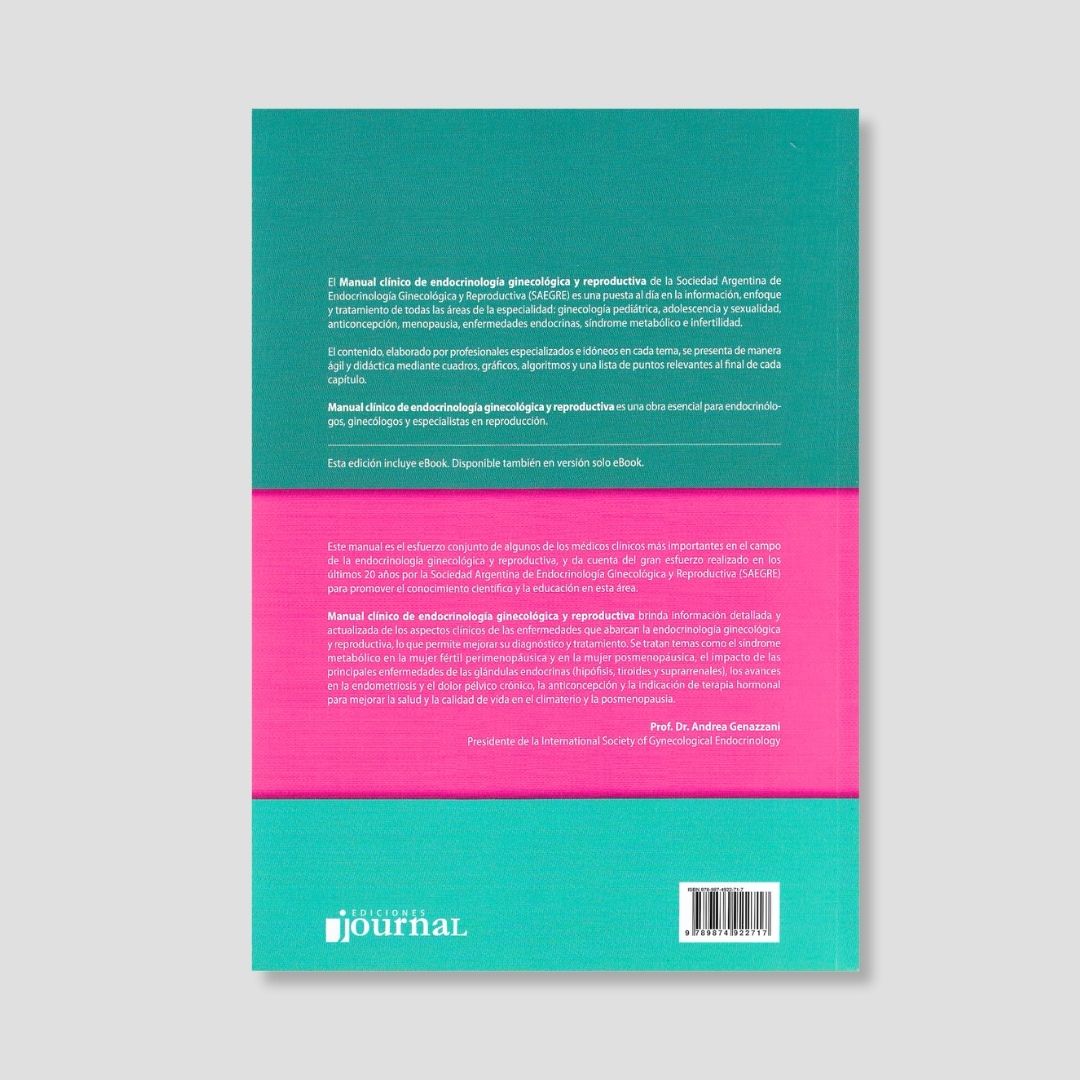 El Manual clínico de endocrinología ginecológica y reproductiva de la Sociedad Argentina de Endocrinología Ginecológica y Reproductiva (SAEGRE) es una puesta al día en la información, enfoque y tratamiento de todas las áreas de la especialidad: ginecología pediátrica, adolescencia y sexualidad, anticoncepción, menopausia, enfermedades endocrinas, síndrome metabólico e infertilidad. El contenido, elaborado por profesionales especializados e idóneos en cada tema, es presentado de manera ágil y didáctica mediante cuadros, gráficos, algoritmos y una lista de puntos relevantes al final de cada capítulo. Manual clínico de endocrinología ginecológica y reproductiva es una obra esencial para endocrinólogos, ginecólogos y especialistas en reproducción. Este manual es el esfuerzo conjunto de algunos de los médicos clínicos más importantes en el campo de la endocrinología ginecológica y reproductiva, y da cuenta del gran esfuerzo realizado en los últimos 20 años por la Sociedad Argentina de Endocrinología Ginecológica y Reproductiva (SAEGRE) para promover el conocimiento científico y la educación en esta área. Manual clínico de endocrinología ginecológica y reproductiva brinda una información detallada y actualizada de los aspectos clínicos de las enfermedades que abarcan la endocrinología ginecológica y reproductiva, lo que permite mejorar su diagnóstico y tratamiento. Se tratan temas como el síndrome metabólico en la mujer fértil perimenopáusica y en la mujer posmenopáusica, el impacto de las principales enfermedades de las glándulas endocrinas (hipófisis, tiroides y suprarrenales), los avances en la endometriosis y el dolor pélvico crónico, la anticoncepción y la indicación de terapia hormonal para mejorar la salud y la calidad de vida en el climaterio y la posmenopausia.