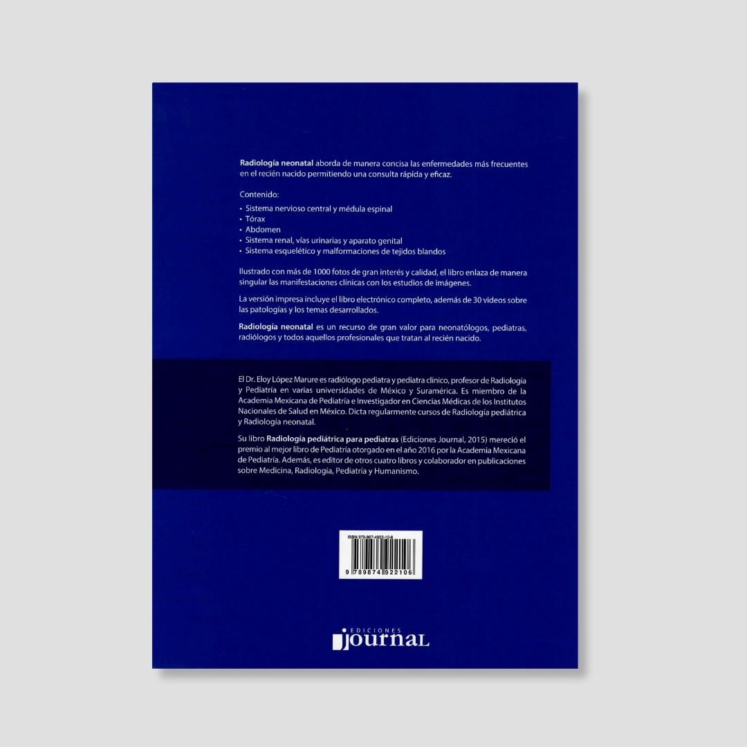 Radiología neonatal, galardonado por la Academia Mexicana de Pediatría con el premio a la “Mejor obra editorial pediátrica” del año 2020, aborda de manera concisa las enfermedades más frecuentes en el recién nacido permitiendo una consulta rápida y eficaz. Ilustrado con más de 1000 fotos de gran interés y calidad, el libro enlaza de manera singular las manifestaciones clínicas con los estudios de imágenes. La versión impresa incluye el libro electrónico completo, además de 30 videos sobre las patologías y los temas desarrollados. Radiología neonatal es un recurso de gran valor para neonatólogos, pediatras, radiólogos y todos aquellos profesionales que tratan al recién nacido. El doctor Eloy López Marure es radiólogo pediatra y pediatra clínico, profesor de Radiología y Pediatría en varias universidades de México y Suramérica. Es miembro de la Academia Mexicana de Pediatría e Investigador en Ciencias Médicas de los Institutos Nacionales de Salud en México. Dicta regularmente cursos de Radiología pediátrica y Radiología neonatal. Su libro Radiología pediátrica para pediatras (Ediciones Journal, 2015) mereció el premio al mejor libro de Pediatría otorgado en el año 2016 por la Academia Mexicana de Pediatría. Además, es editor de otros cuatro libros y colaborador en publicaciones sobre Medicina, Radiología, Pediatría y Humanismo. Contenido: -Sistema nervioso central y médula espinal -Tórax -Abdomen -Sistema renal, vías urinarias y aparato genital -Sistema esquelético y malformaciones de tejidos blandos
