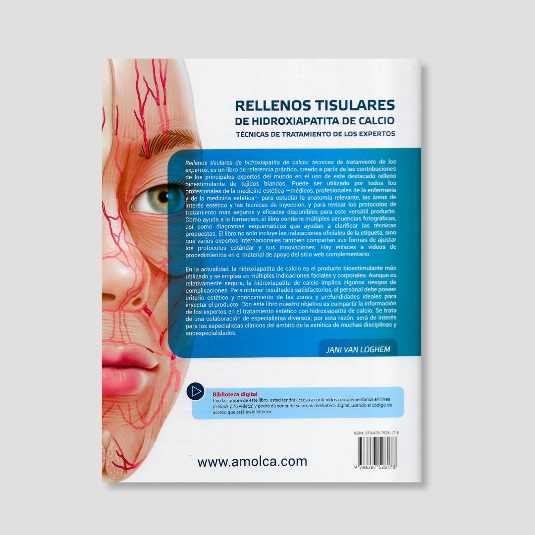 La hidroxiapatita de calcio es una fórmula patentada por Radiesse ® y aprobada por la FDA que ha dado muy buenos resultados en los tratamientos antienvejecimiento, no solo del rostro sino de diferentes partes del cuerpo. Jani van Loghem, médico esteticista neerlandés que ha trabajado con colegas de todo el mundo y que actualmente es el jefe de departamento de Medicina Estética del European College of Aesthetic Medicine and Surgery , ha preparado este libro pensando en instruir acerca de las propiedades y la práctica de inyección de hidroxiapatita de calcio como procedimiento mínimamente invasivo. La obra, compuesta por 39 capítulos ,ilustrada con más de 350 imágenes y fotografías, y sustentada con más de 5 horas de videos, presenta la técnica de expertos de ocho países para inyectar relleno de hidroxiapatatita de calcio. Las zonas del cuerpo donde los expertos inyectan este componente incluyen el tercio superior de la cara, el tercio medio y el tercio inferior de la cara, el cuello y el torso, las extremidades y las zonas íntimas. Los capítulos presentan la técnica paso a paso y el uso, el posicionamiento de la cánula para una inyección más efectiva y segura, cuáles son las zonas de riesgo anatómico, los cuidados postratamiento y tratamientos adicionales. Algunos de los capítulos están centrados en tratamientos de inyección para tercios de la cara de pacientes masculinos y un capítulo ha sido escrito para orientar a los doctores acerca del tratamiento y manejo de complicaciones tras la inyección de hidroxiapatita cálcica.