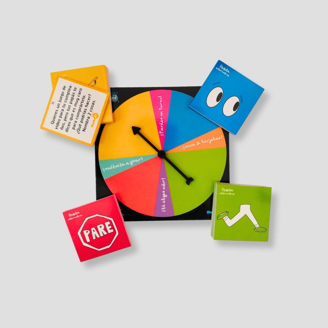 Ruleta Alternativa es un juego terapéutico y educativo diseñado para abordar problemas de conducta e impulsividad en los niños, promoviendo el desarrollo de habilidades emocionales, sociales y cognitivas de manera lúdica y segura. A través de su dinámica, se fomenta la identificación de sentimientos, pensamientos y estímulos que pueden llevar a actuar de forma impulsiva o inapropiada, facilitando la reflexión y el aprendizaje de estrategias para manejar estas situaciones.