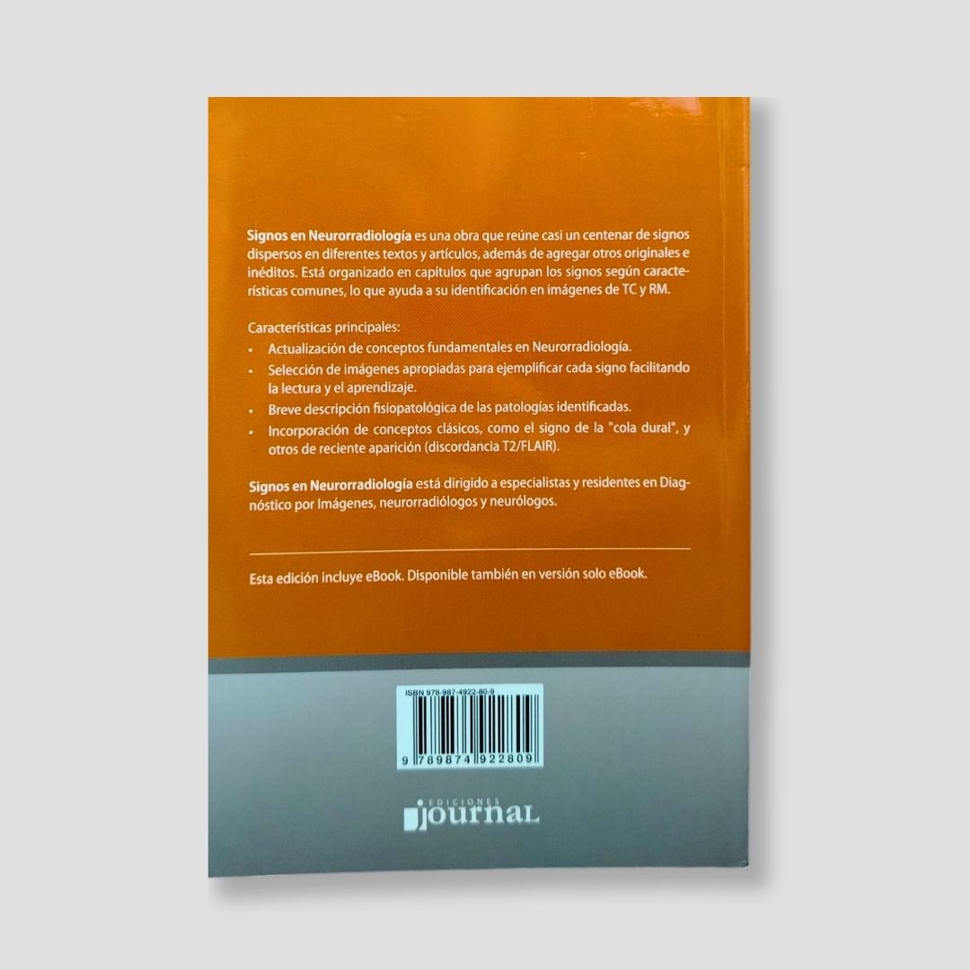 Signos en Neurorradiología: obra práctica que reúne y organiza cerca de cien signos neurorradiológicos para su identificación en TC y RM. Con imágenes seleccionadas, explicaciones fisiopatológicas claras y conceptos clásicos y actuales, es una referencia útil para especialistas y residentes en diagnóstico por imágenes, neurorradiología y neurología.