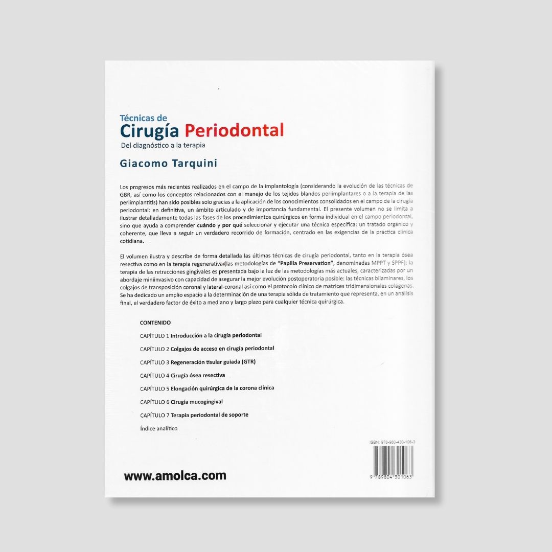 “Los progresos más recientes realizados en el campo de la implantología (considerando la evolución de las técnicas de GBR, así como los conceptos relacionados con el manejo de los tejidos blandos periimplantares o a la terapia de las periimplantitis) han sido posibles solo gracias a la aplicación de los conocimientos consolidados en el campo de la cirugía periodontal: en definitiva, un ámbito articulado y de importancia fundamental. El presente volumen no se limita a ilustrar detalladamente todas las fases de los procedimientos quirúrgicos en forma individual en el campo periodontal, sino que ayuda a comprender cuándo y por qué seleccionar y ejecutar una técnica específica: un tratado orgánico y coherente, que lleva a seguir un verdadero recorrido de formación, centrado en las exigencias de la práctica clínica cotidiana. El volumen ilustra y describe de forma detallada las últimas técnicas de cirugía periodontal, tanto en la terapia ósea resectiva como en la terapia regenerativa (las metodologías de “Papilla Preservation”, denominadas MPPT y SPPF); la terapia de las retracciones gingivales es presentada bajo la luz de las metodologías más actuales, caracterizadas por un abordaje miniinvasivo con capacidad de asegurar la mejor evolución postoperatoria posible: las técnicas bilaminares, los colgajos de transposición coronal y lateral-coronal así como el protocolo clínico de matrices tridimensionales colágenas. Se ha dedicado un amplio espacio a la determinación de una terapia sólida de tratamiento que representa, en un análisis final, el verdadero factor de éxito a mediano y largo plazo para cualquier técnica quirúrgica.”