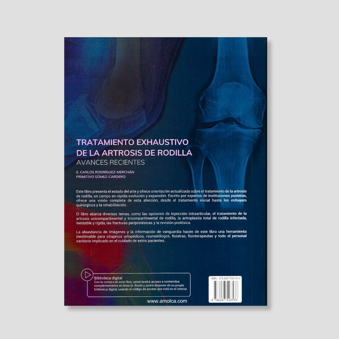 Tratamiento exhaustivo de la artrosis de rodilla: avances recientes, es una obra editada por los doctores E. Carlos Rodríguez-Merchán y Primitivo Gómez-Cardero, médicos ortopedistas del Hospital Universitario La Paz, en Madrid, y en ella reúnen la experiencia de colegas que examinan de manera integral todo lo relacionado con los tratamientos de la rodilla con artrosis. Con la ayuda de más de 100 imágenes, el libro se destaca porque aborda cuáles son los medicamentos orales y tópicos para el tratamiento, la rehabilitación física del paciente, el tratamiento con ácido hialurónico, plasma rico en plaquetas y gas ozono. Asimismo, la obra está complementada con capítulos que se centran en la artrosis patelofemoral, la artrodistiasis, artrosis de rodilla unicompartimental y tricompartimental, rodilla infectada, así como la revisión de artoplastia de rodilla y el abordaje de complicaciones posoperatorias. Esta obra se convierte en un recurso único para ortopedistas y traumatólogos que deseen ampliar su conocimiento sobre la artrosis de rodilla, pero también puede servir para fisioterapeutas que requieran una exposición más completa sobre los posibles tratamientos que puedan manejarse en paciente con este trastorno.