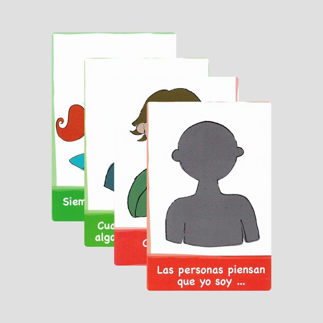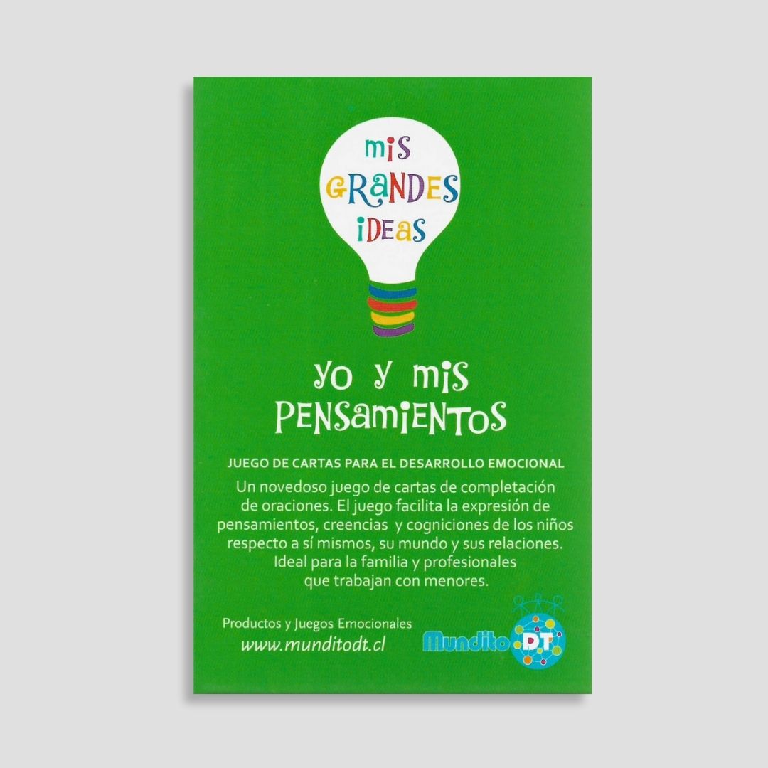 Yo y mis pensamientos es un juego de cartas orientado al desarrollo emocional de los niños, diseñado para facilitar la expresión de pensamientos, creencias y percepciones sobre sí mismos, sus experiencias y el entorno que los rodea. A través de la dinámica de completación de oraciones, el material crea un espacio seguro y guiado donde los niños pueden comunicar su mundo interno de manera natural y espontánea.